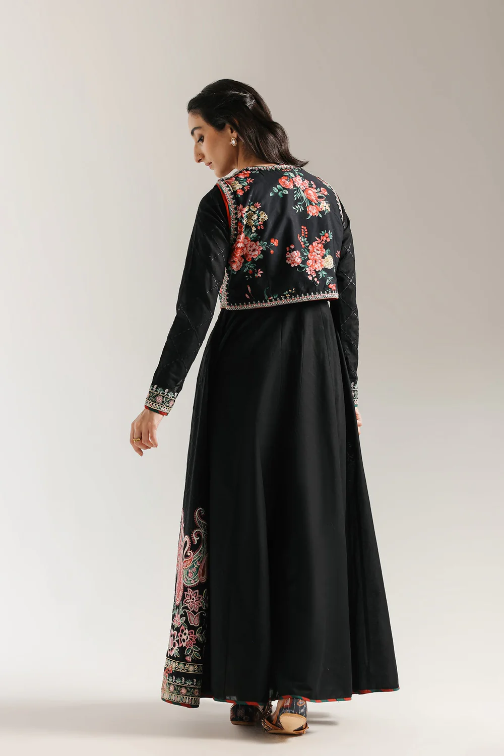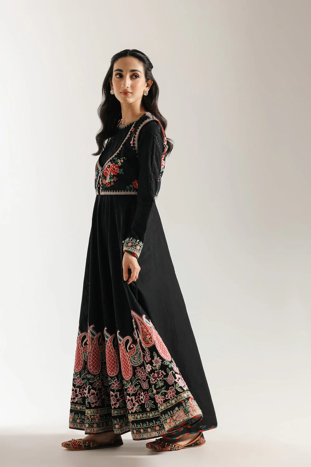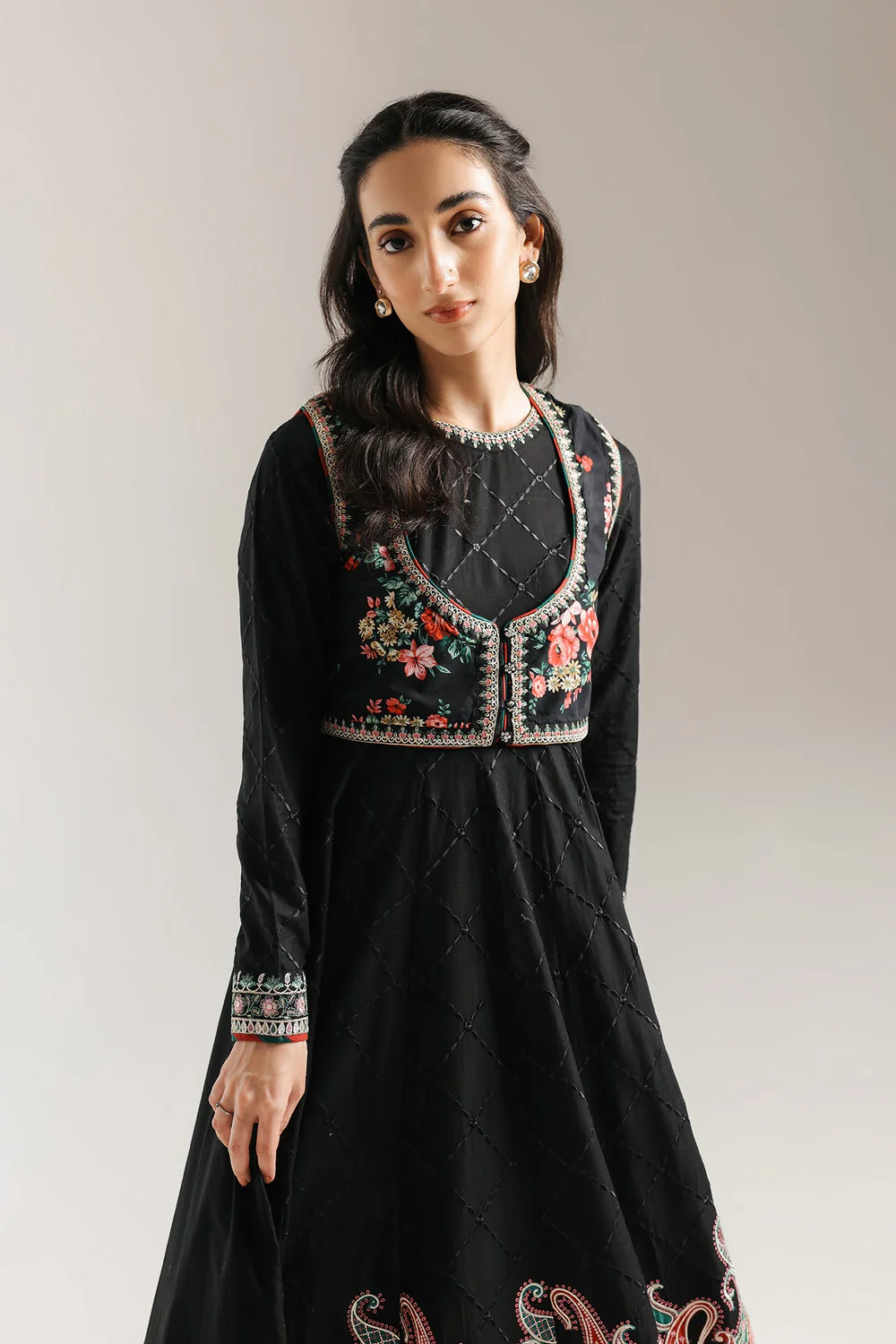 This exquisite black dress is a masterpiece of design, blending traditional elegance with modern sophistication. The outfit features a flowing, full-length dress in a solid black fabric with a subtle checkered pattern. It is beautifully styled with a short, embroidered waistcoat that sits over the bodice. The waistcoat is a vibrant burst of color, adorned with intricate floral embroidery in shades of red, pink, and green. The dress is further elevated by a spectacular, wide border at the hemline, showcasing a detailed, colorful paisley and floral pattern. This ensemble is a perfect choice for a grand celebration, offering a timeless and captivating look.