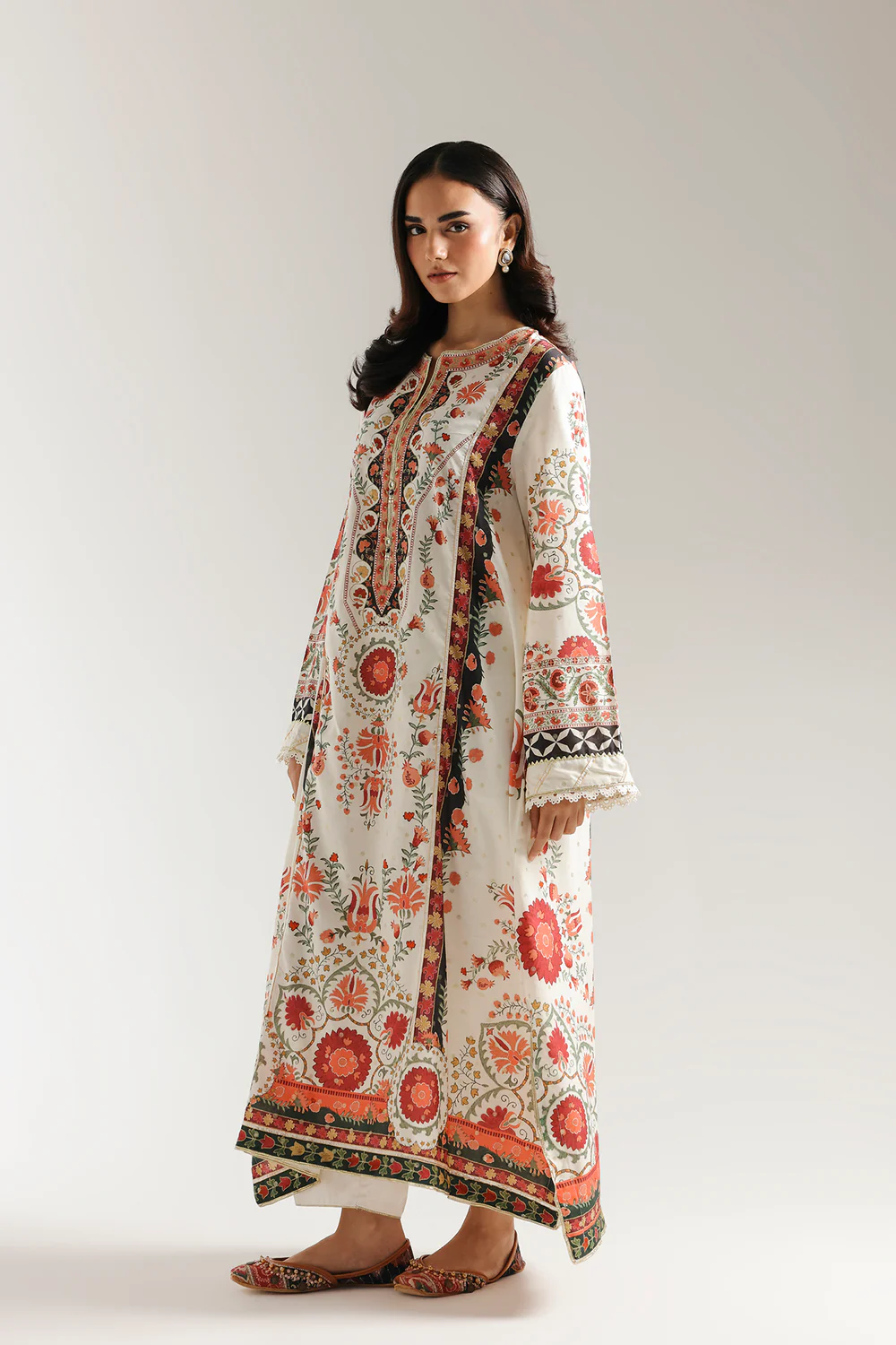 -Experience the charm of classic elegance with this jacquard suit. This two-piece ensemble features a shirt with an intricate paisley and floral print in shades of green, pink, and orange. The shirt is complemented with wideleg shalwar that feature delicate zari dots and a beautiful border. This suit is the perfect choice for making a sophisticated statement at any event.