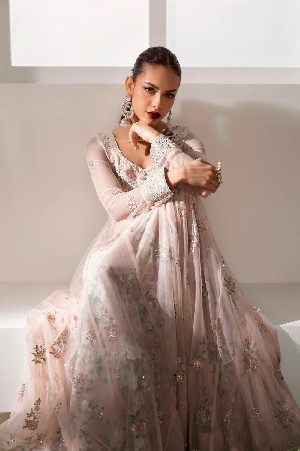 This beautiful suit features a sophisticated and elegant design in a classic white and lilac color palette. The long tunic is a pristine white, adorned with intricate floral and scroll embroidery in a deep indigo blue. The detailed work extends across the bodice and the full sleeves, creating a rich and elaborate pattern. The tunic’s hemline and sleeves are finished with a delicate, scalloped trim, adding a touch of softness. It is paired with simple, white wide-legged trouser, allowing the stunning top to be the focal point. This ensemble is a timeless and graceful choice for any special occasion.